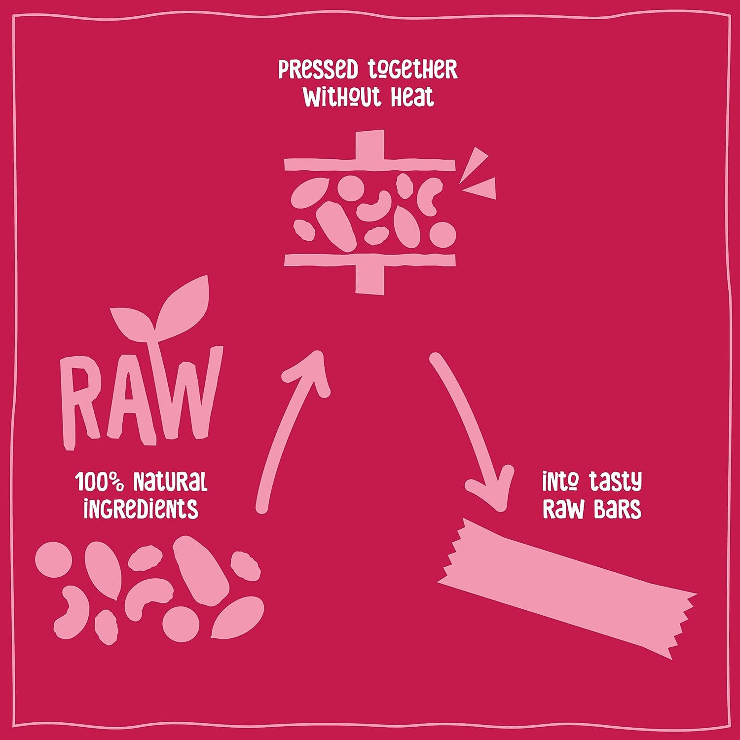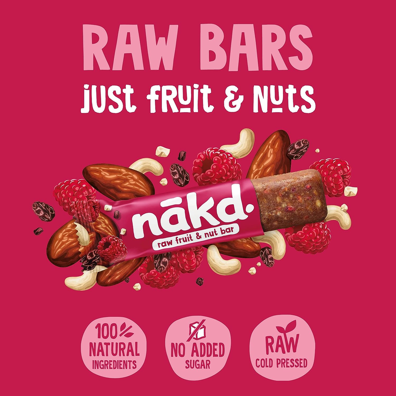 • Ingredients: raw dates 49%, raw cashews 31%, raw raisins 17%, raw raspberries 3%, a hint of natural berry flavour.
